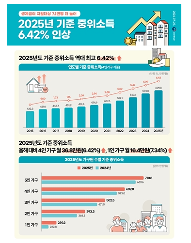 기준 중위소득 6.42% 인상 역대 최대 4인가구 609만 원