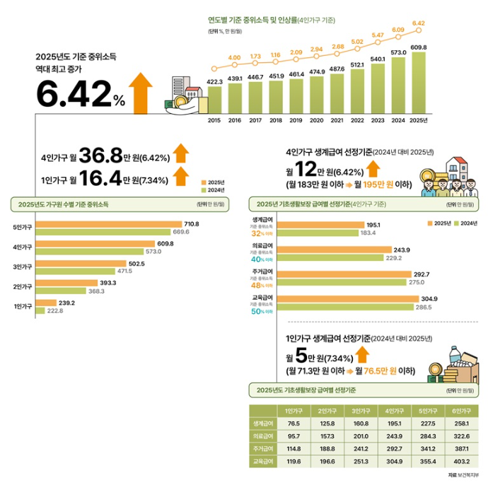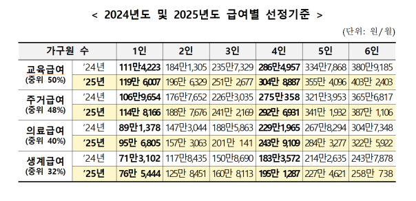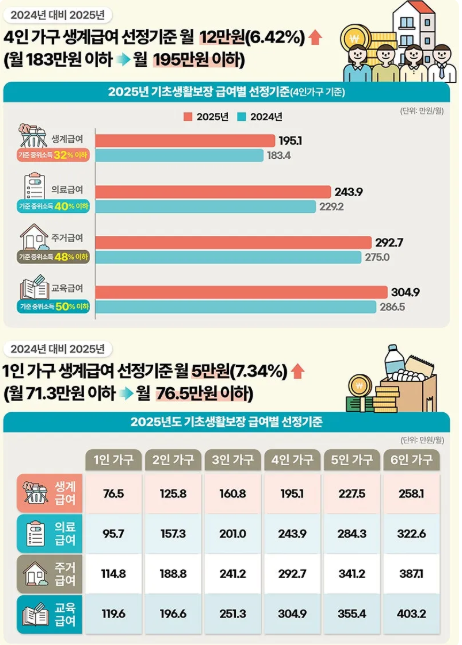 이는 7.34%의 증가율을 보이며, 2인 가구는 1,178,435원이 1,258,451원으로 인상됩니다. 이러한 변화는 생계급여 수급자들에게 실질적인 도움이 될 것입니다.