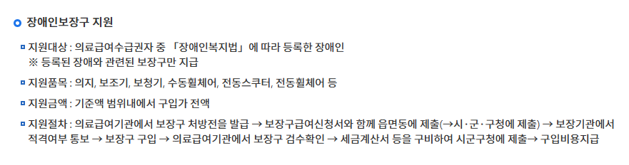 2. 지원 품목: 의지, 보조기, 보청기, 휠체어 등.