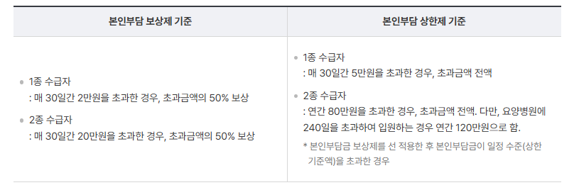 1) 1종 수급권자: 30일간 본인부담금이 2만원 초과 시 초과금액의 50% 보상.