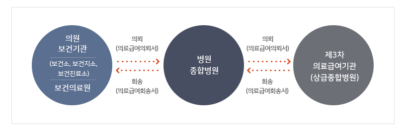 2) 2차(병원, 종합병원) 또는 3차(지정병원) 진료가 필요한 경우, 의료급여의뢰서를 발급받아 단계적으로 진료 진행.