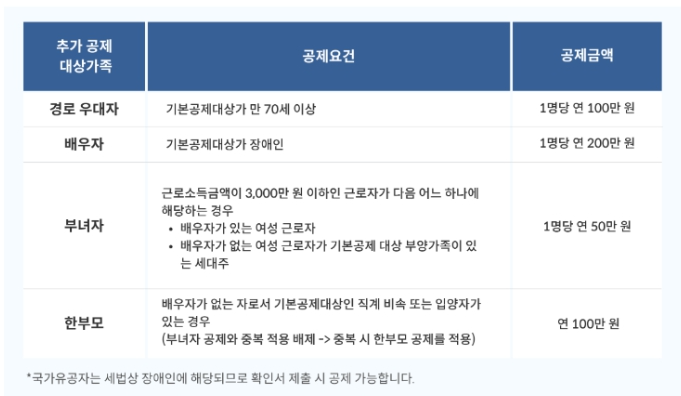 2. 공제 대상: 소득이 일정 기준 이하인 배우자 및 부양 가족