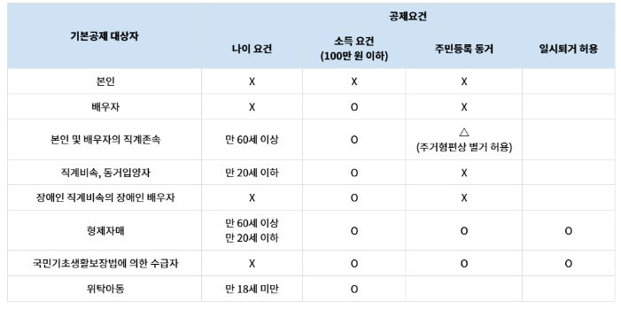 3. 부모 및 조부모(시부모): 60세 이상이어야 하며 소득 요건을 충족해야 합니다. 함께 살고 있는지 여부는 소득 요건 충족 여부에 영향을 미칠 수 있습니다.
