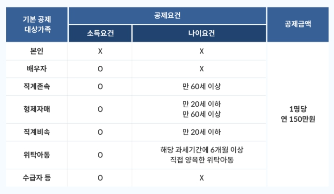 부양가족 공제는 본인의 소득 외에 특정 기준을 충족하는 가족을 부양하고 있는 경우 적용되는 공제입니다.