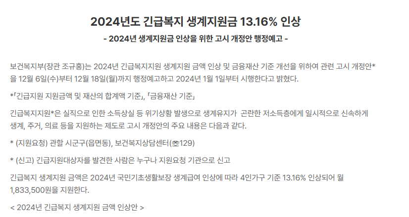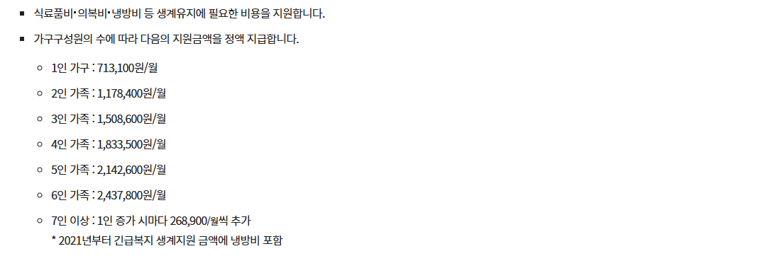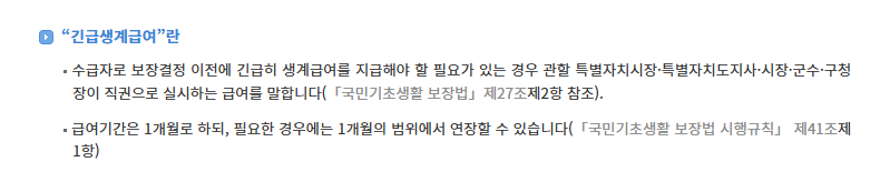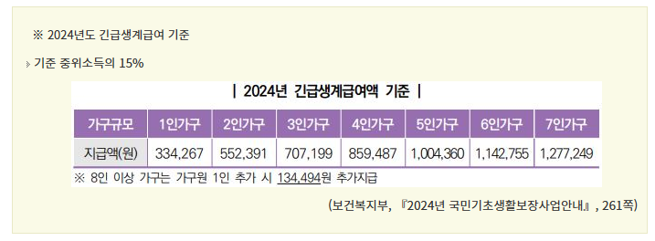 갑작스러운 위기 상황으로 인해 생계가 어려운 가구를 대상으로 정부와 지방자치단체가 제공하는 임시적인 지원으로 최소한의 생계비를 보장하는 데 중점을 둡니다.