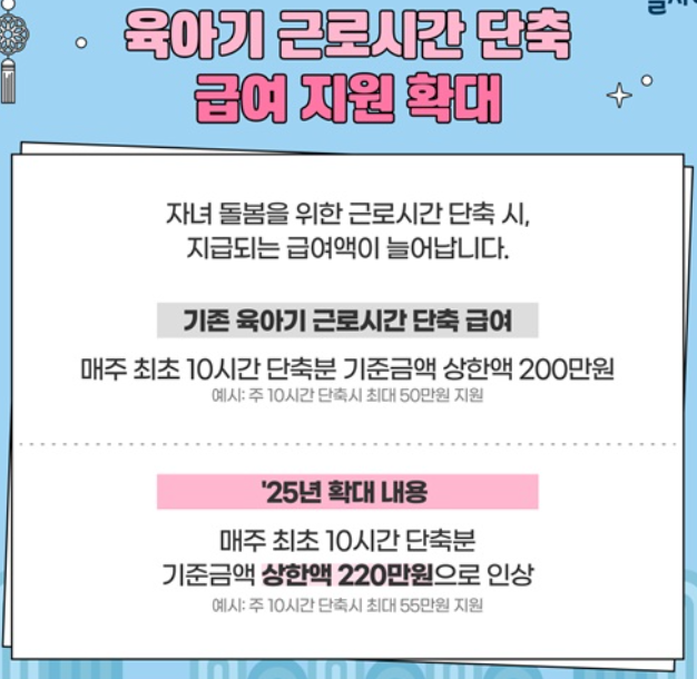 2025년 변경: 육아휴직 및 근로시간 단축 모두에 대해 월 20만 원 지급