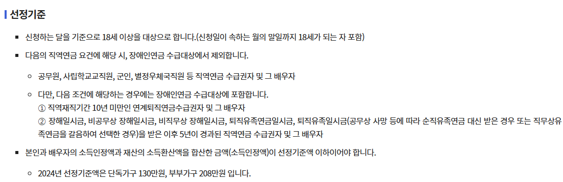 지급 기준 | 소득 기준, 장애 정도 | 국민연금 가입 기간, 장애 등급 |
