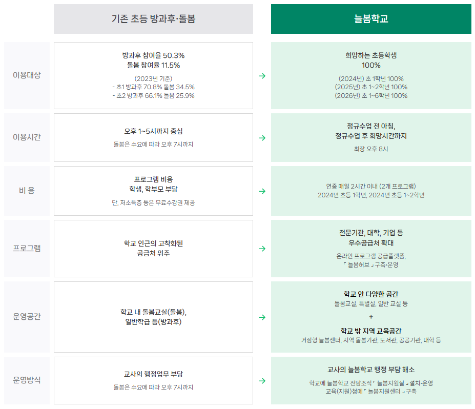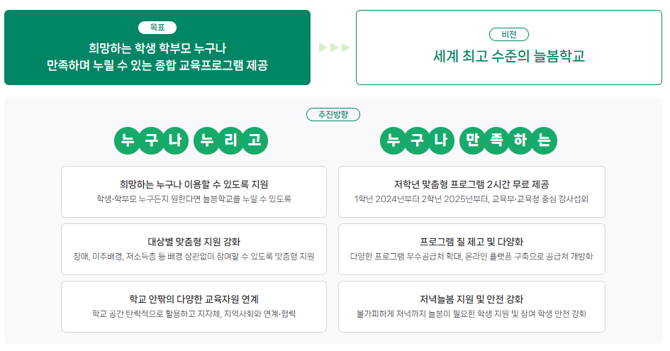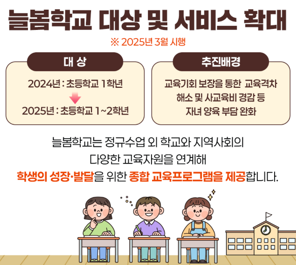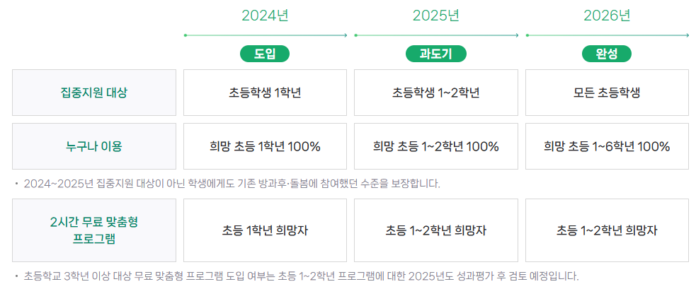 2025년 3월부터 초등학교 1학년에서 2학년까지 대상을 확대하며, 기존의 정규 수업 외에 학교와 지역사회의 다양한 교육 자원을 연계하여 학습 격차 해소와 사교육비 부담 완화를 목표로 하고 있습니다.