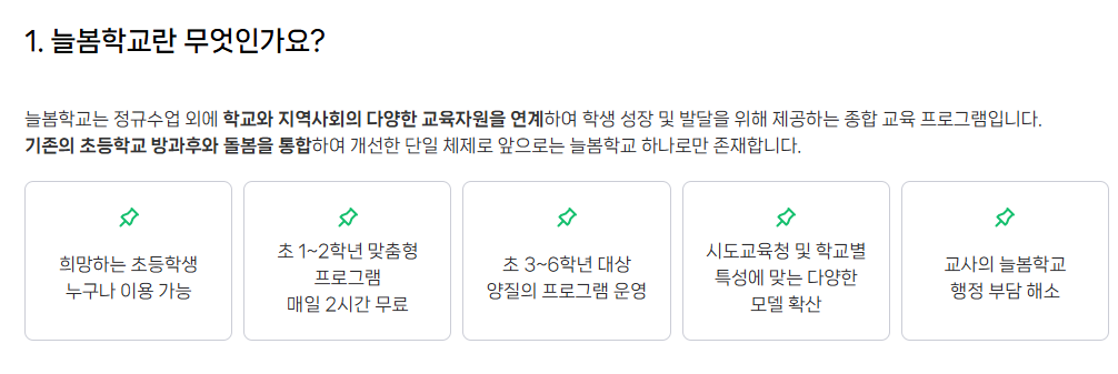 기존의 초등학교 방과후와 돌봄을 통합하여 개선한 단일 체제로 앞으로는 늘봄학교 하나로만 존재합니다.