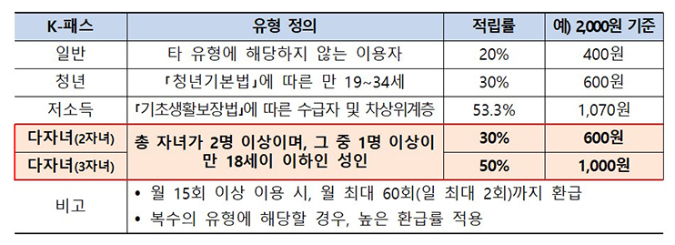 다자녀 가구를 대상으로 한 대중교통비 환급 정책인 'K-패스'가 새롭게 도입되었습니다. 이는 2자녀 이상 가구의 경제적 부담을 줄이고 대중교통 이용을 촉진하기 위한 정책 입니다.
