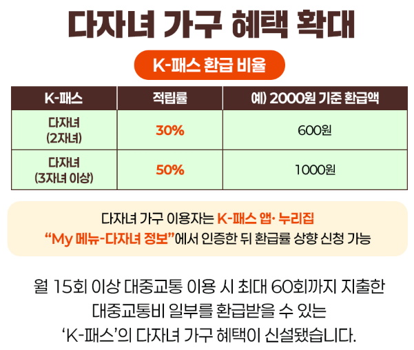 K-패스는 대중교통비 일부를 환급해 주는 프로그램으로, 특히 다자녀 가구를 대상으로 한 환급 비율이 크게 확대되었습니다.