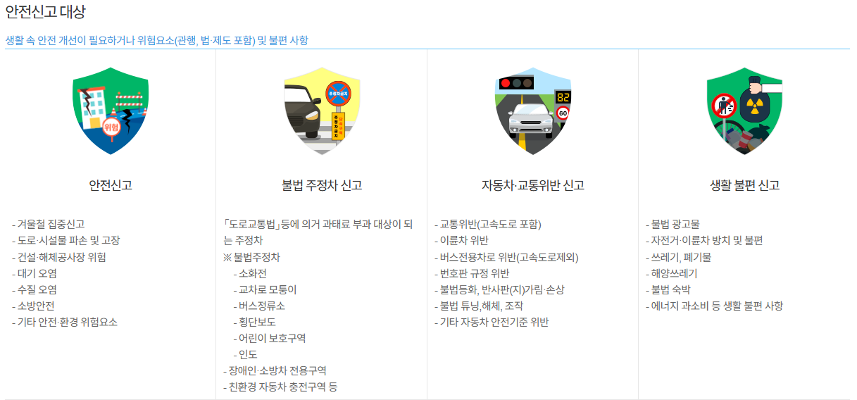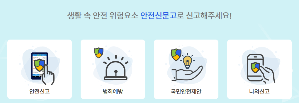 재난 또는 그 밖의 사고·위험으로부터 국민의 안전을 확보하기 위하여 안전위험 상황을 행정기관 등에 신고하는 행위입니다.