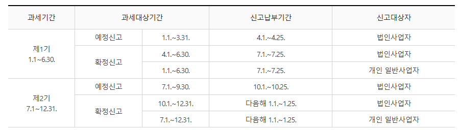 1기(1~6월) : 신고 및 납부 기한은 7월 1일~7월 25일입니다.