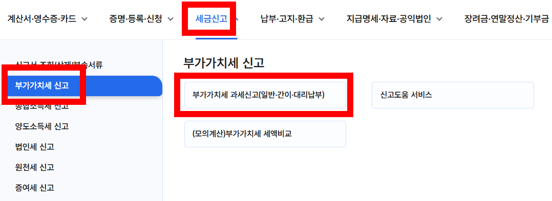 1) 국세청 홈택스에 로그인 -> [신고/납부] 메뉴에서 부가가치세 신고서 작성