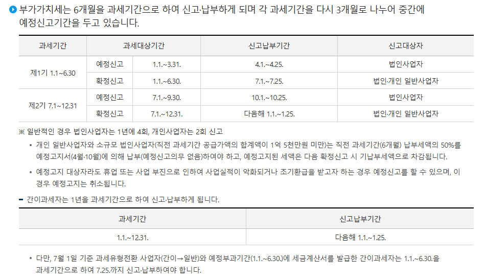 2기(7~12월) : 신고 및 납부 기한은 다음 해 1월 1일~1월 25일입니다.