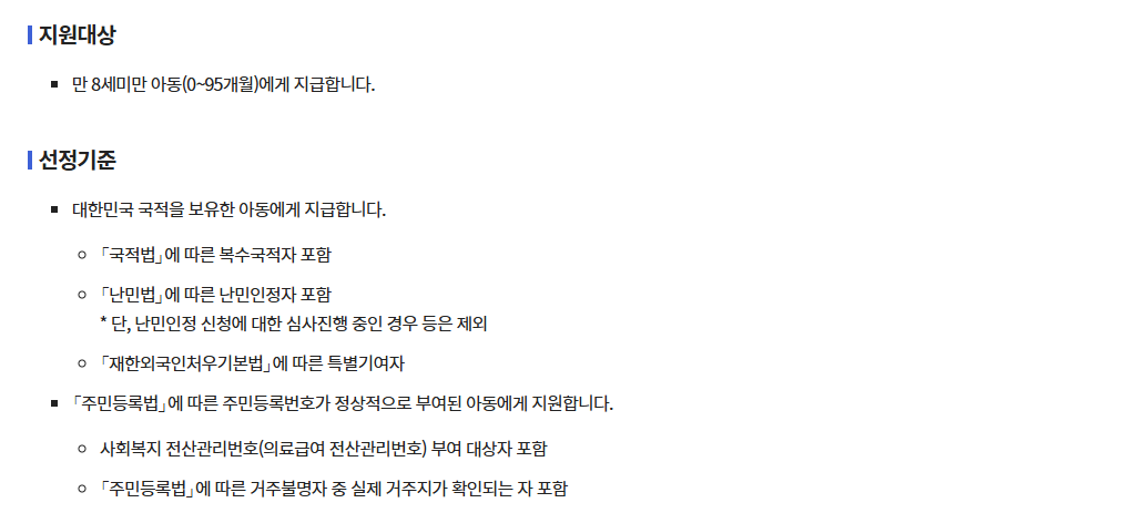 지급 대상은 8세 미만(출생일부터 95개월) 아동입니다. 출생신고가 완료된 날부터 신청이 가능하며, 생일이 속한 달까지만 지급됩니다.