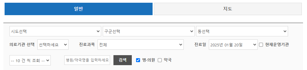 필요 정보 입력: 원하는 지역, 시간대 등을 입력하여 문 여는 병원 및 약국을 검색합니다.