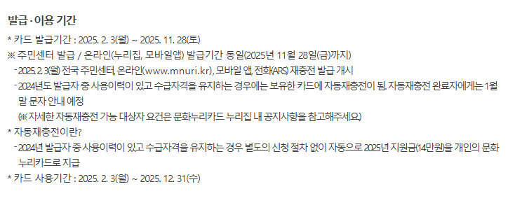 6세 이상의 기초생활수급자 및 법정 차상위계층을 대상으로 하며, 2025년 문화누리카드의 발급 기간은 2월 3일부터 11월 28일까지입니다.