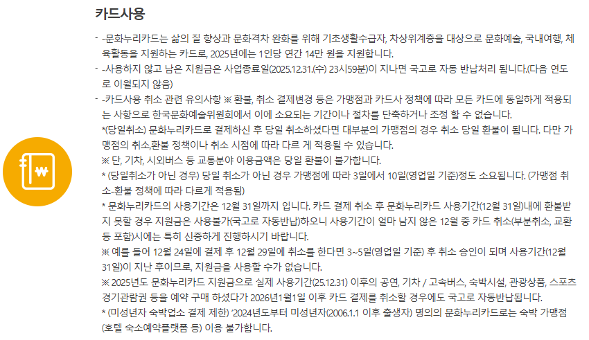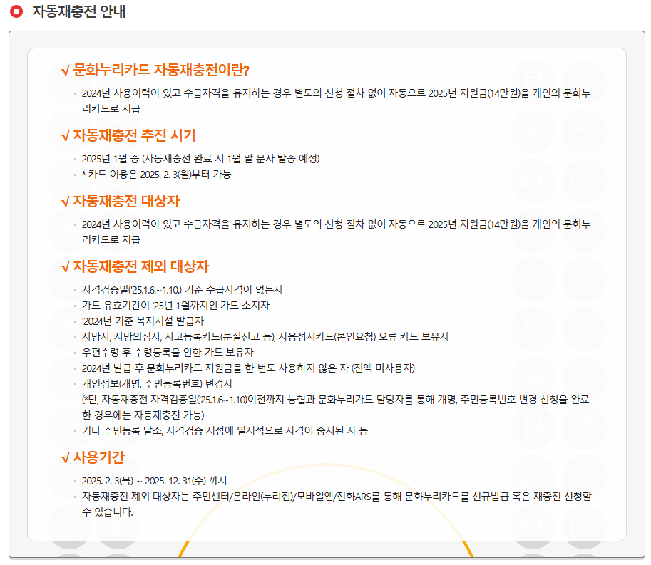 기존 문화누리카드 이용자 중 수급 자격을 유지하는 경우, 별도의 신청 절차 없이 자동으로 올해 지원금이 충전됩니다.