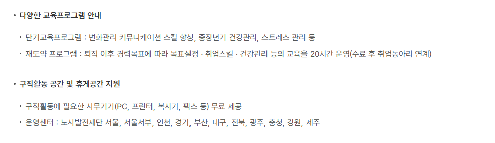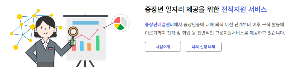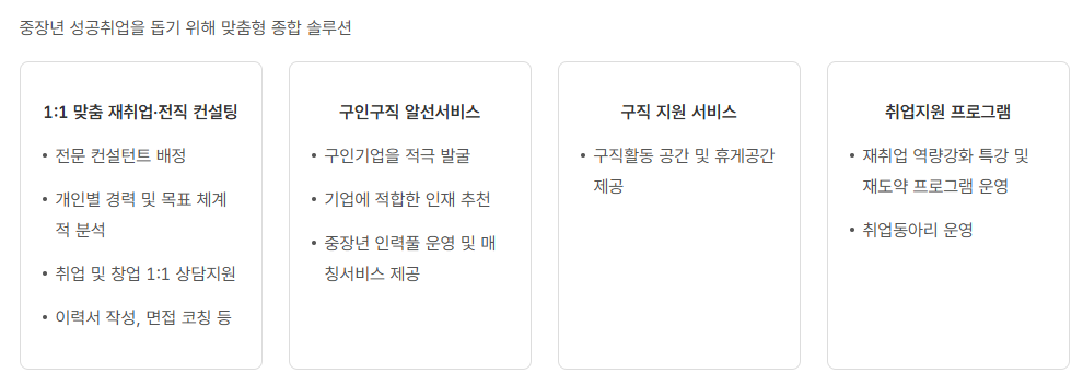 중장년층의 재취업 및 경력 개발을 지원하고, 다양한 프로그램을 통해 이들에게 필요한 정보와 자원을 제공하고 있습니다.