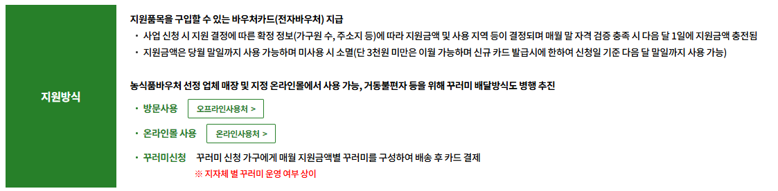 저소득층 가구의 건강한 식생활을 지원하기 위한 정부 사업으로, 기존의 생계급여나 긴급복지 지원처럼 현금으로 제공되는 것이 아닌, 신선 농산물 및 필수 식재료를 구입할 수 있는 전용 바우처 카드를 지원합니다.