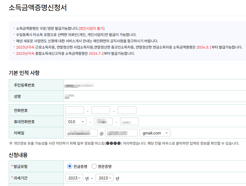 3. 소득금액증명 선택 및 발급 : 소득금액증명을 선택하고, 발급 연도 및 용도를 입력한 후 신청합니다.