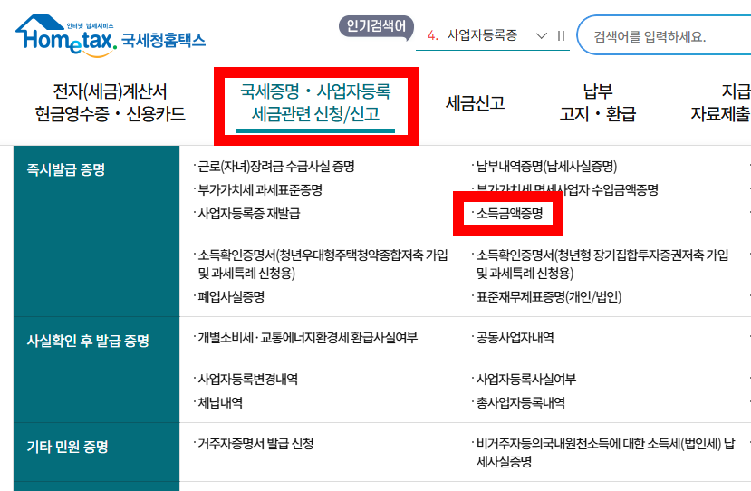 2. 민원증명 선택 : 상단 메뉴에서 '민원증명'을 선택한 후, '소득금액증명'을 클릭합니다.