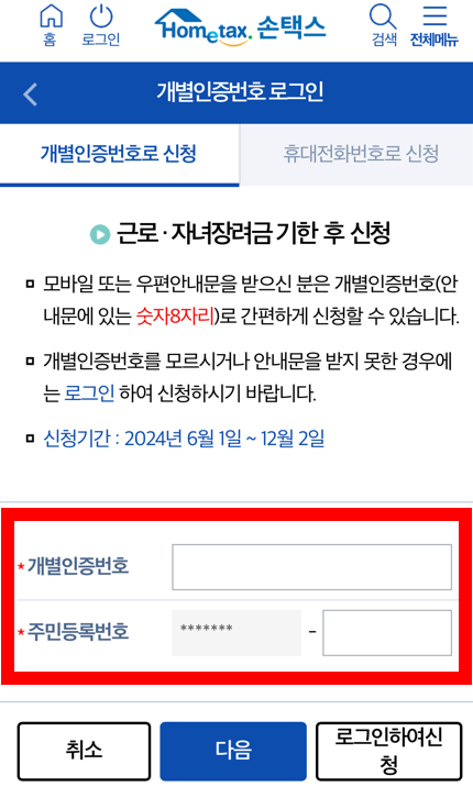4) 주민등록번호 7자리와 개별인증번호 입력 후 신청 완료