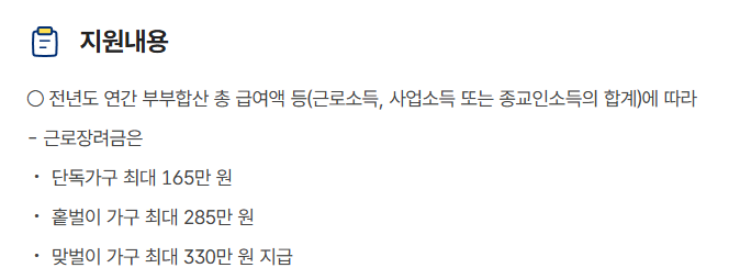 소득과 재산이 일정 금액 미만인 근로자, 종교인 또는 사업자(전문직 제외)가구에 대해 일하는 만큼 가구원 구성과 총급여액 등(부부합산)에 따라 산정된 근로장려금을 지급하여 근로를 장려하고 소득을 지원하는 제도 입니다.