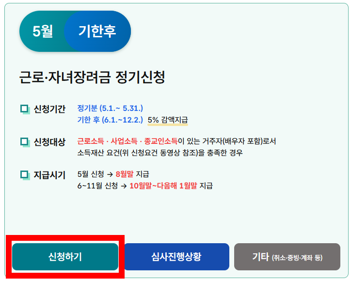 정기 근로장려금 신청은 매년 5월 1일부터 31일까지 진행되며, 지급은 같은 해 8월에 이루어집니다.