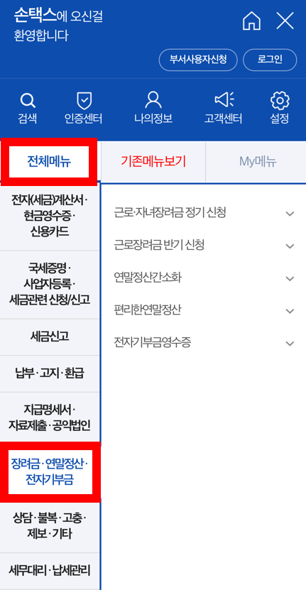 2) [전체메뉴]→[장려금,연말정산,전자기부금]선택