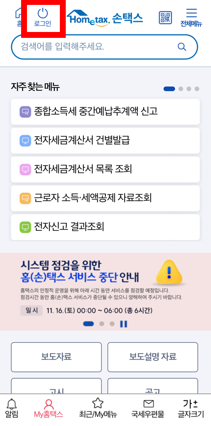 2. 로그인: 공동인증서 또는 카카오톡, 네이버 인증서를 사용해 로그인합니다.