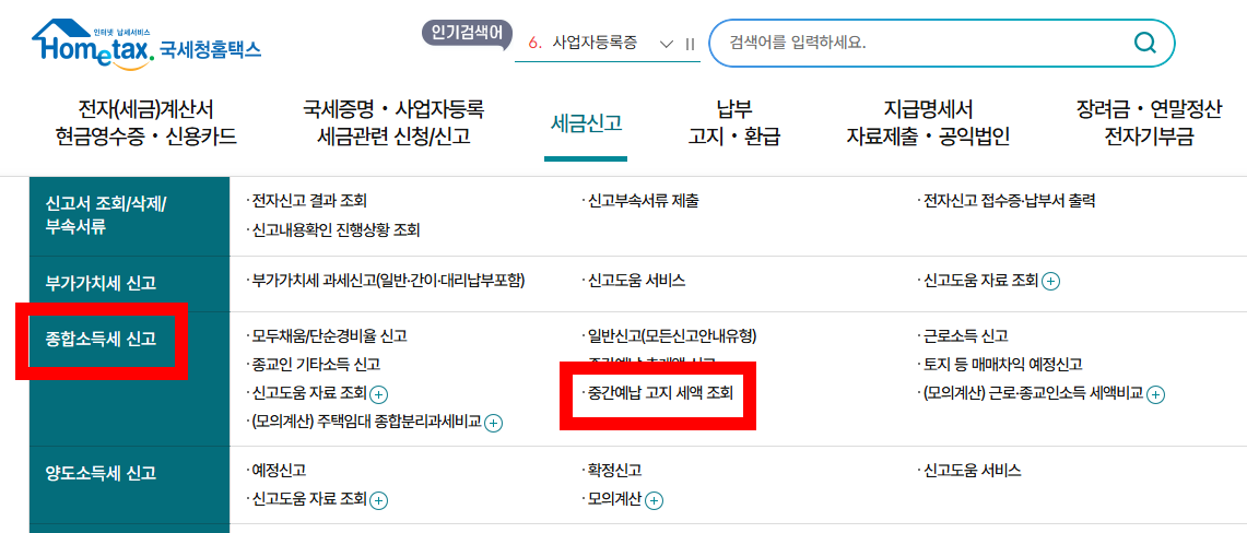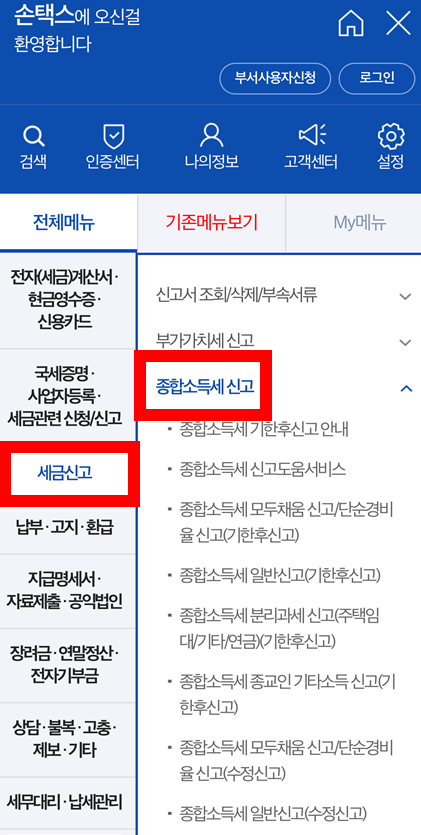 3. 신고 메뉴 선택: 상단 메뉴에서 “신고/납부”를 선택한 후, “종합소득세”를 클릭합니다.