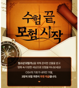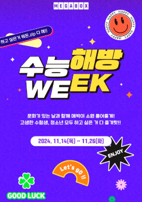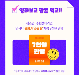 1) CGV : 수능 수험표 제시 시 영화 티켓 7,000원에 구매 가능, 무한 지급