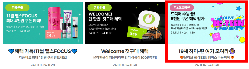 1) 올리브영(Olive Young) : 수험표 제시 시 특별 쿠폰 제공(최대 30% 할인)