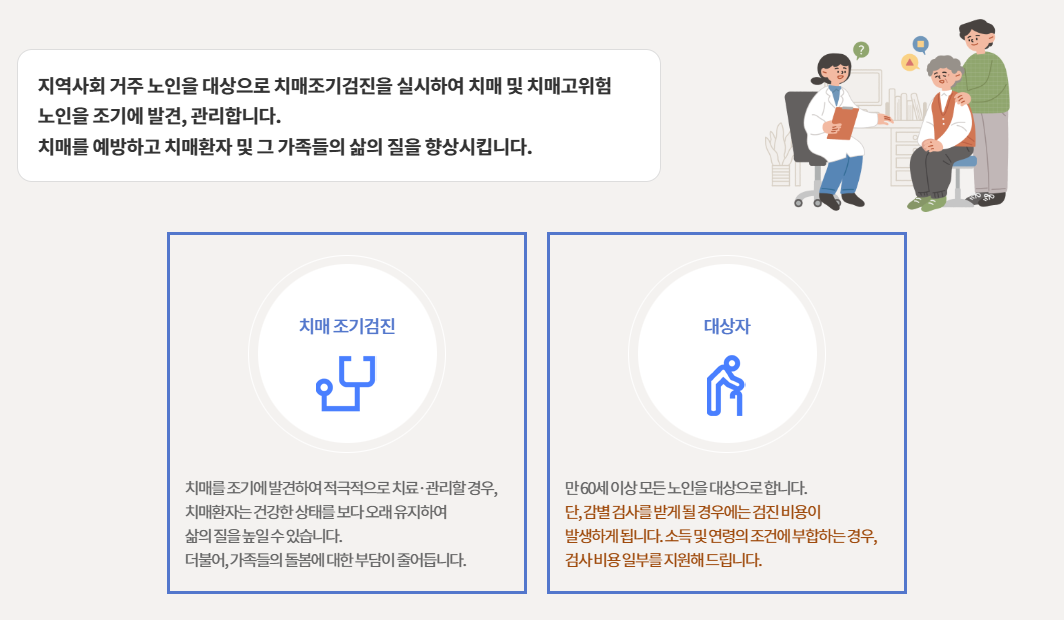 '치매 조기검진'은 치매안심센터에서 간단한 인지기능 검사부터 전문적인 신경심리검사까지 무료 또는 저렴한 비용으로 제공합니다.