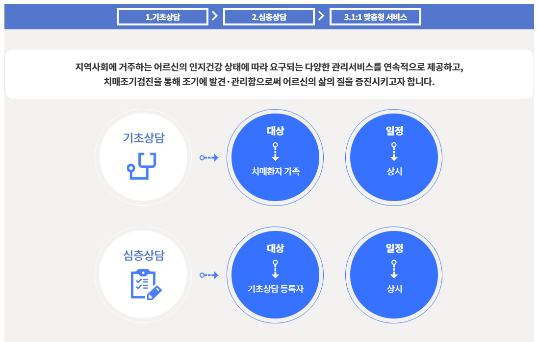 특히, 치매 가족의 돌봄 부담을 줄이기 위해 심리 상담과 돌봄 가이드를 제공하며 치매 관리에 있어 체계적이고 통합적인 서비스를 제공합니다.