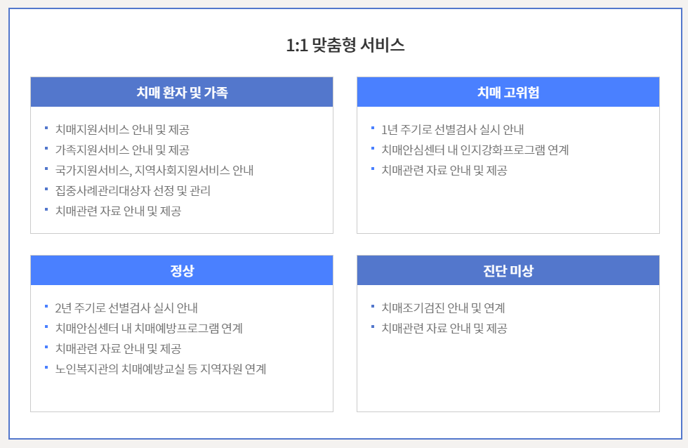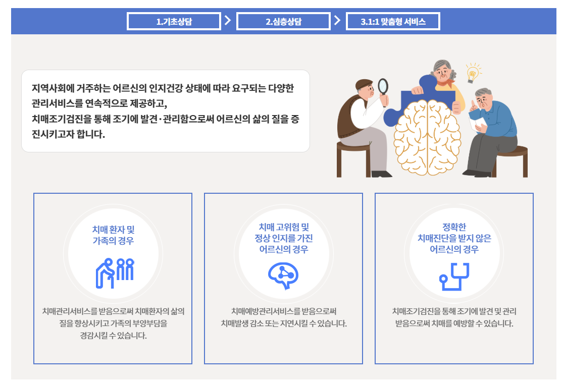 주요 서비스로는 치매 상담, 조기 검진, 치매 환자를 위한 맞춤형 돌봄 서비스 제공 등이 있습니다.