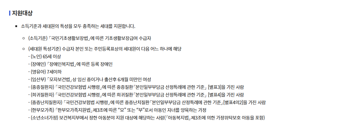 지원 대상 | 소득 기준 중위소득 75% 이하의 가구 |