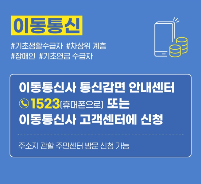 주소지 관할 주민센터 방문 신청 또는 이동통신사 고객센터에 신청 가능.