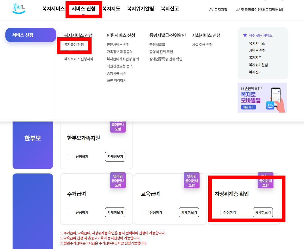 ( ↓ 복지로 로그인 > 서비스 신청 > 복지급여 신청 > 차상위계층 확인 > 대상 서비스 선택)