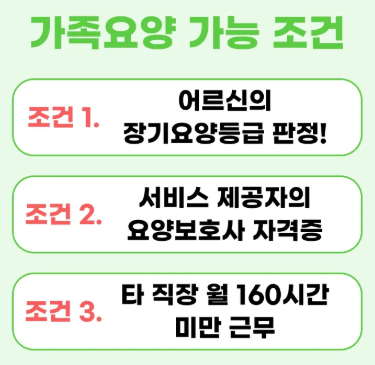 3. 수급자 등급: 돌봄을 받을 가족은 노인장기요양보엄 수급자로 등록되어야 하며, 1~5등급 중 하나를 받아야 합니다.