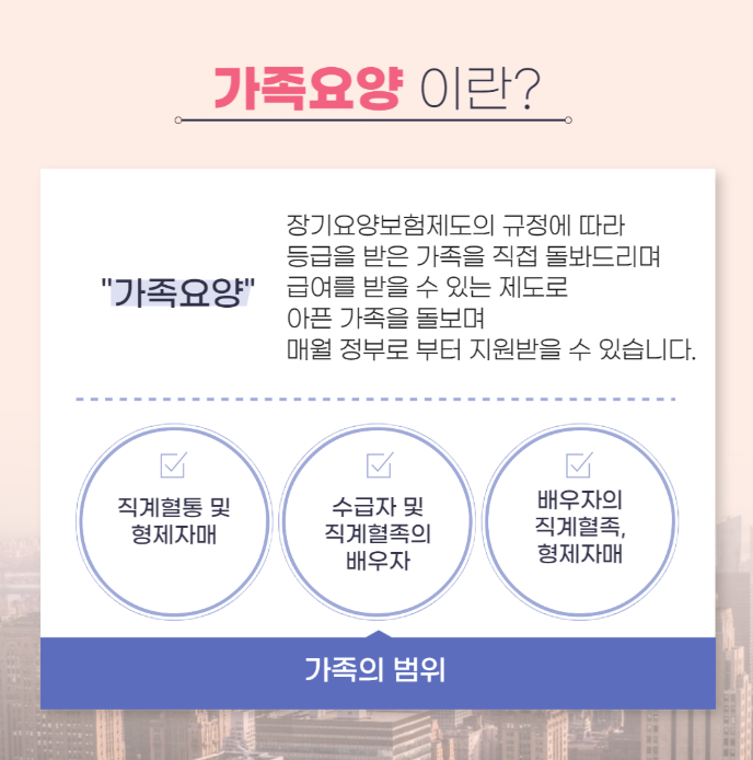 가족요양의 범위는 직계가족, 형제자매, 배우자, 배우자의 직계혈족으로 한정됩니다. 이러한 범위는 가족요양 서비스의 적용 대상을 명확히 하여, 서비스 제공의 효율성을 높이는 데 기여합니다.