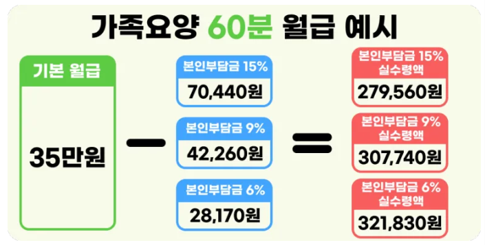 예를 들어, 90분의 가족요양 서비스에 대한 급여는 기본적으로 800,000원이 책정됩니다. 여기서 15%, 9%, 6%의 세 가지 기여율에 따라 실수령액이 달라지게 됩니다.