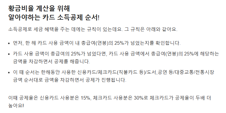 신용카드 공제는 연간 소득에 따라 사용한 신용카드 금액의 일부를 세금에서 공제받는 제도입니다. 기본적으로 신용카드 사용액이 총급여의 25%를 초과해야 공제를 받을 수 있습니다.