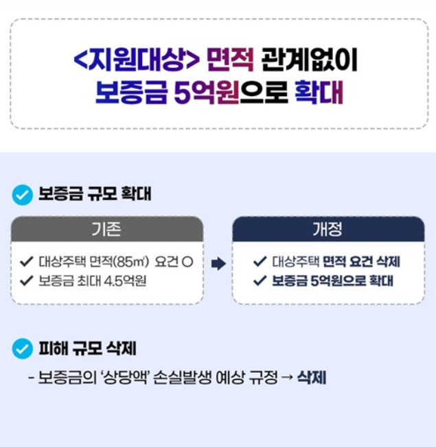 피해자의 인정 범위를 확대하고, 보증금 한도를 기존 3억원에서 5억원으로 상향 조정하였습니다. 더 많은 피해자들이 지원을 받을 수 있도록 하기 위한 것입니다.