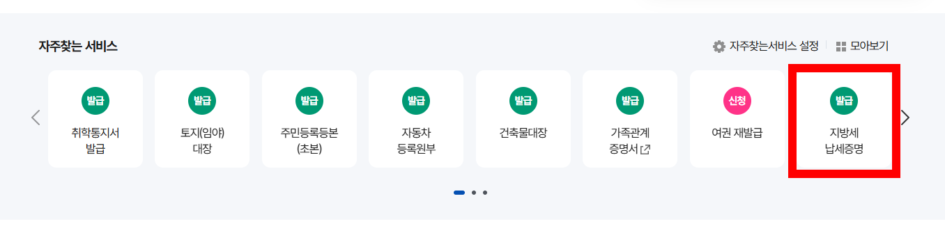 메인 화면에서 "지방세 납세증명서 발급" 메뉴를 클릭합니다.