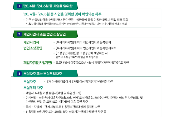 2020년 4월 ~ 2024년 6월 기간 중 사업을 영위(휴,폐업 포함)한 개인사업자 및 소상공인에게 지원하고 있습니다.