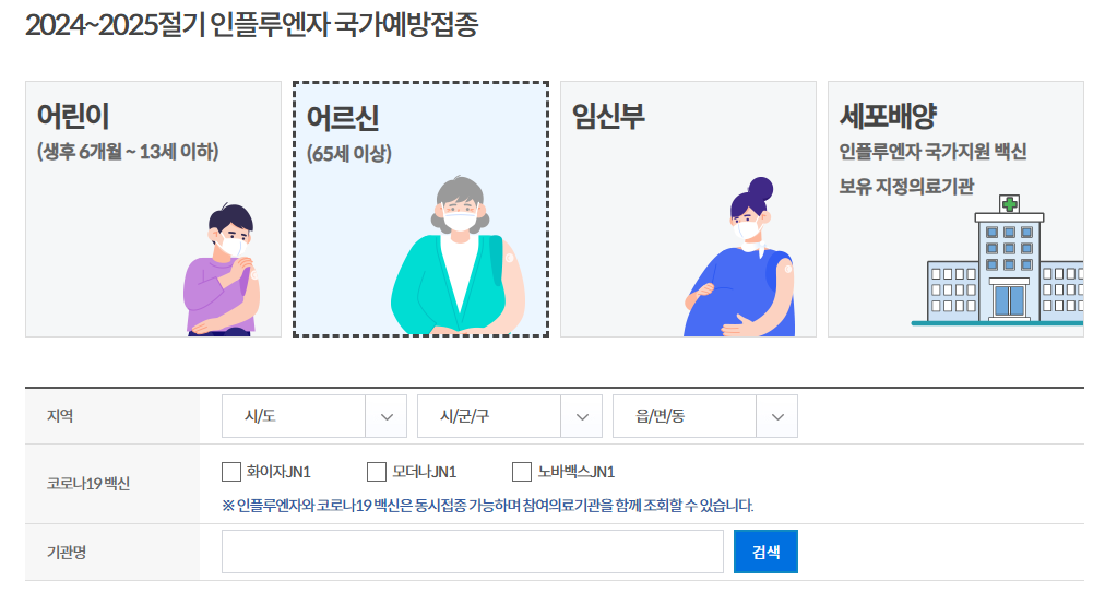 65세 이상의 고령자는 보건소, 병원, 약국 등에서 접종을 받을 수 있으며, 보건소에서 주관하는 무료접종 행사에 참여하거나 병원에 방문하여 접종이 가능합니다.