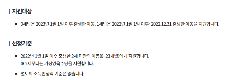 2022년 1월 1일 이후 출생한 0세에서 23개월까지의 아동을 양육하는 부모에게 지원됩니다. 아동의 양육을 지원하기 위해 매달 일정 금액을 지급하는 형태로 운영됩니다.